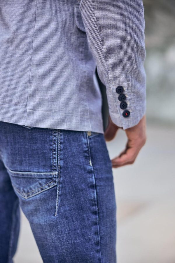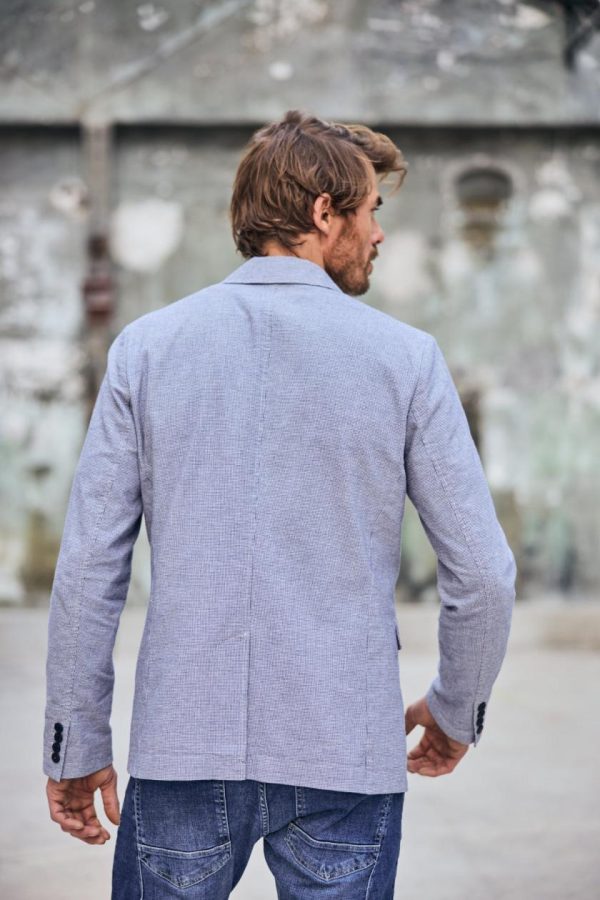 • Matière légèrement stretch, pied de poule dans les tons bleus et blancs, toucher lin